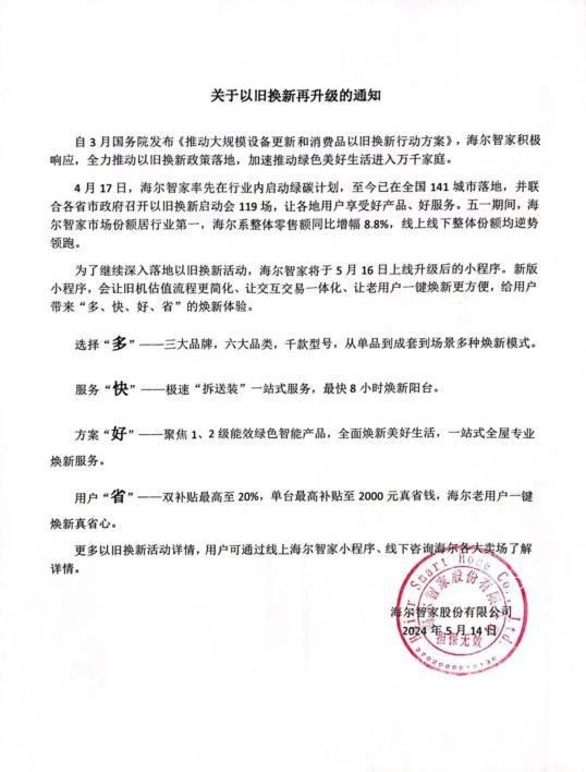 据悉,此次活动是海尔智家以旧换新行动中的其中一环。作为政策的积极践行者,海尔智家从4月17日提出“绿碳计划”以来,在一个月的时间里不仅实现了政策的快速响应、广泛落地,打造了行业第一个以旧换新线上小程序;同时也在五一期间以整体零售额 8.8%的同比增幅再夺行业第一。