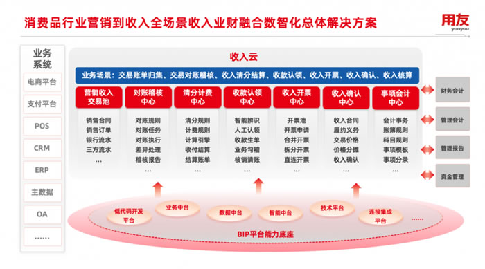 用友BIP收入云与大消费品行业联合发布的这一解决方案,融合了用友在财务管理领域的深厚积累和大消费品行业的丰富实践经验。采用先进的人工智能、大数据分析等技术手段,对企业收入数据进行全面整合和深入分析,为企业提供全面的收入管理支持!