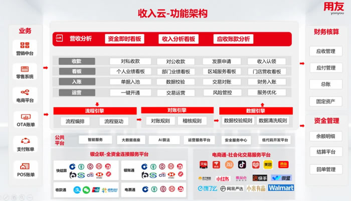 用友BIP收入云整合了对公/对私收款能力,满足消费品企业在日常经营过程中各类收款场景,实现一点接入,无缝收款。无论是连锁门店在线收款、电商平台全资金分析、品牌私域会员储值收款等不同对私付款场景,还是转账收款、账单收款、预存收款等对公付款场景,都能实现。