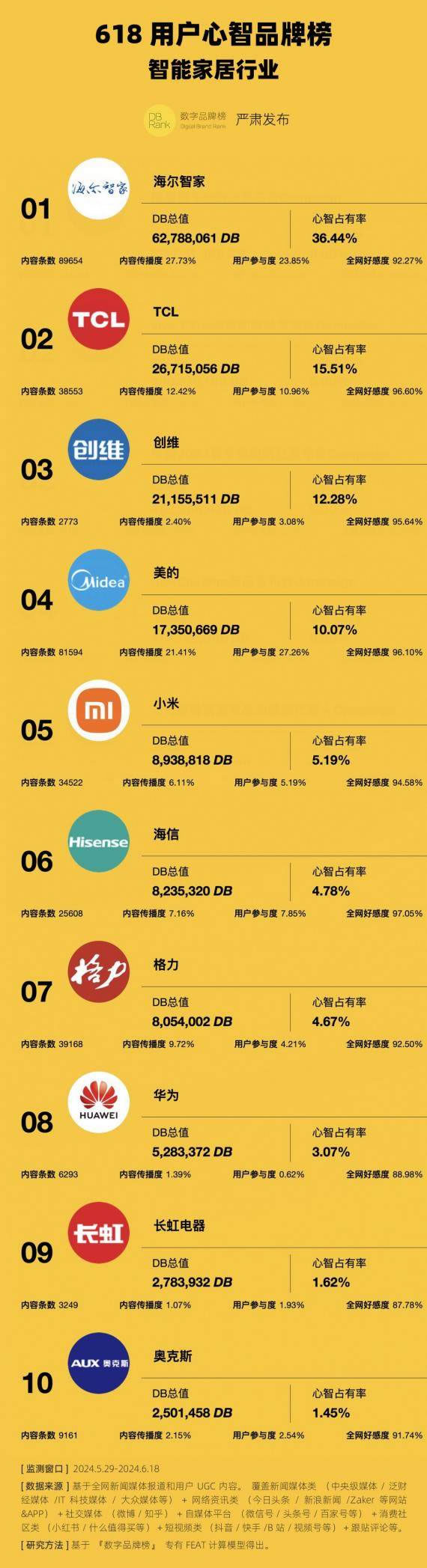 支撑在多个第一、销售高增长背后的,是各大品牌之间的深层次角逐较量——用户心智。『数字品牌榜』以2024年5月29日-2024年6月18日为时间窗口,推出“618用户心智品牌榜-智能家居行业”榜单,海尔智家以62,788,061DB的数字品牌价值、36.44%的行业用户心智占有率位列榜首。