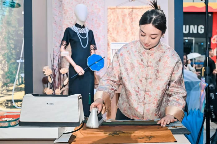 “密度不同,姆米数越大,产生的褶皱越难熨平,需反复熨烫。但是这款产品可以让我实现再深的褶皱也能一熨就平,基本一两分钟就能熨完一件衣服,大大提高了熨烫效率。”卡萨帝铂金智能熨烫机与传统熨烫机不同,输出的是5Bar螺旋式强劲蒸汽,可以1s穿透织物,重焕面料光彩的同时又能避免纤维损伤,让非遗传承人有了更多精力设计衣物款式。