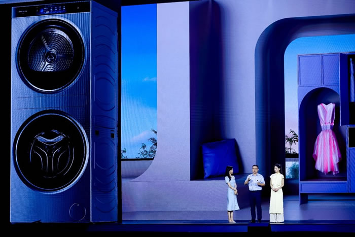 护衣上,用户希望家里的衣服能实现“洗涤自由”,无论丝绸、亚麻,还是毛呢大衣的洗涤、护理,都让用户感到步骤繁琐、费心费力。为此,卡萨帝致境洗烘护一体机搭载了能护理高端面料的“月光宝盒”,配合专用织物靓色滋养液,可实现真丝等面料的塑形和亮色修复。云感射频技术还可以将滋养液雾化成微米级的粒子,深入衣物纤维进行养护,相当于给衣物做SPA。