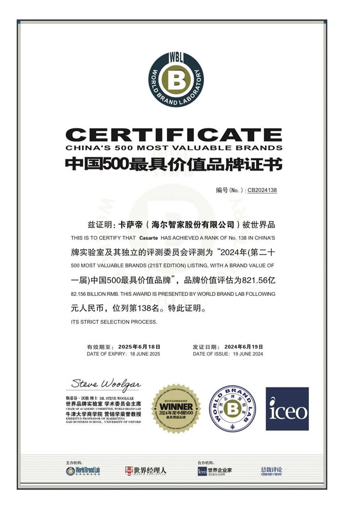 6月19日,据全球权威机构世界品牌实验室(World Brand Lab)的2024年《中国500最具价值品牌》分析报告,卡萨帝以821.56亿品牌价值上榜,是唯一入选的高端家电品牌,较2023年跃升了110亿,这已经是卡萨帝连续四年登上该榜单。