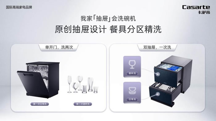 6月27日,卡萨帝发布一组对比海报,以其首创的抽屉式洗碗机,向用户展示了分类“一次洗”的洗碗新体验。相对于传统洗碗机一个洗涤舱一次只能选择一种洗涤程序,卡萨帝抽屉式洗碗机能做到不同餐具分成不同洗涤程序同时洗涤。