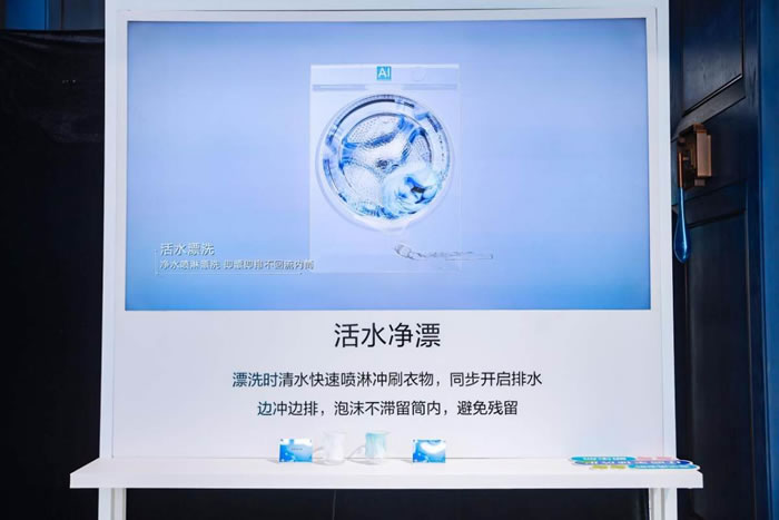 洗衣机甩干时的振动噪音问题,也会影响用户的生活。现场工作人员则通过将装满水的水杯放置在海尔云溪系列洗衣机上演示。开启高速脱水后,海尔云溪洗衣机平稳安静水面纹丝不动。此外,据工作人员介绍海尔云溪系列洗衣机还创新升级了活水精华洗,它能将少量水、洗衣液预混合成精华液,高压喷到衣服上,边喷边洗,让衣服洗得又快又干净。升级的活水净水漂则能做到净水喷淋,像在水龙头下冲洗一样,可以漂洗得更彻底,防止化学残留刺激皮肤。