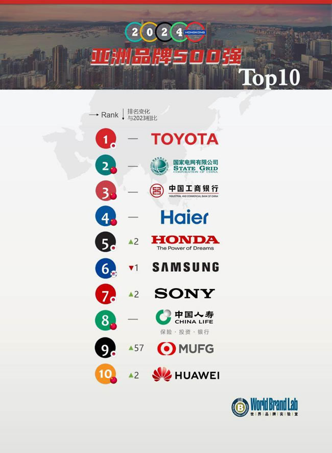 9月25日,由世界品牌实验室(World Brand Lab)主办的“亚洲品牌大会”在香港召开。大会发布了2024年(第十九届)《亚洲品牌500强》年度报告,共有来自20个国家和地区的超级品牌入选,丰田、国家电网、中国工商银行、海尔、本田名列榜单前五。其中,海尔已经连续19年上榜亚洲品牌500强,以唯一物联网生态品牌蝉联第4名。