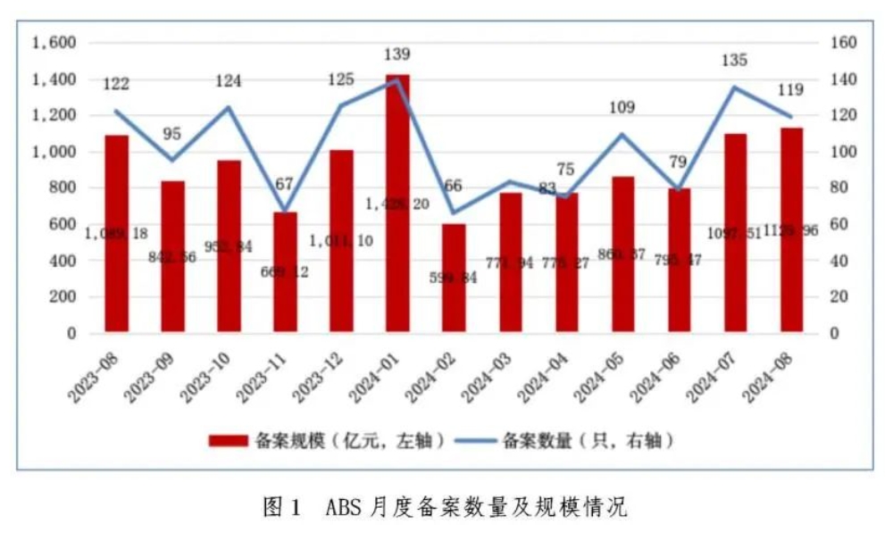 中国基金业协会近日发布的数据显示,2024年8月,资产支持专项计划(ABS)新增备案119只,新增备案规模合计1129.96亿元。其中基础设施公募REITs所投ABS备案1只、19.74亿元。
