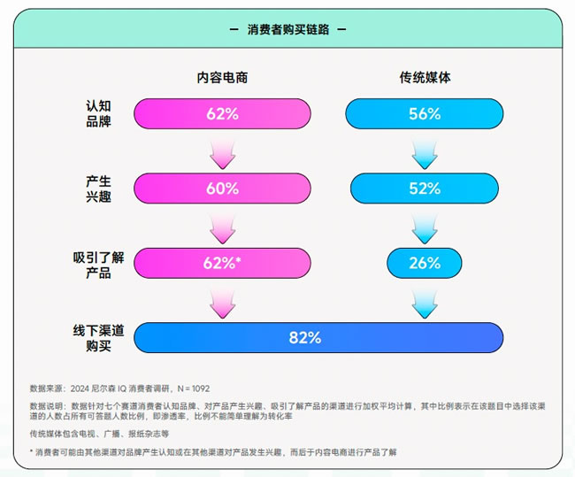 此外,内容电商平台对消费者全域购买行为的影响也非常显著。据白皮书调研数据显示,62%的消费者是通过内容渠道认识到一个品牌,远超传统媒体56%的占比。尤其在高消费领域,消费者受内容电商种草影响而线下购买的概率,显著高于传统媒体。