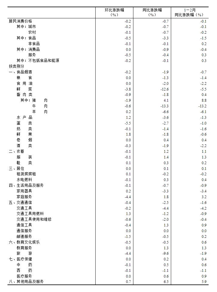 2月份,全国居民消费价格环比下降0.2%。其中,城市下降0.2%,农村下降0.1%;食品价格下降0.5%,非食品价格下降0.1%;消费品价格持平,服务价格下降0.5%。