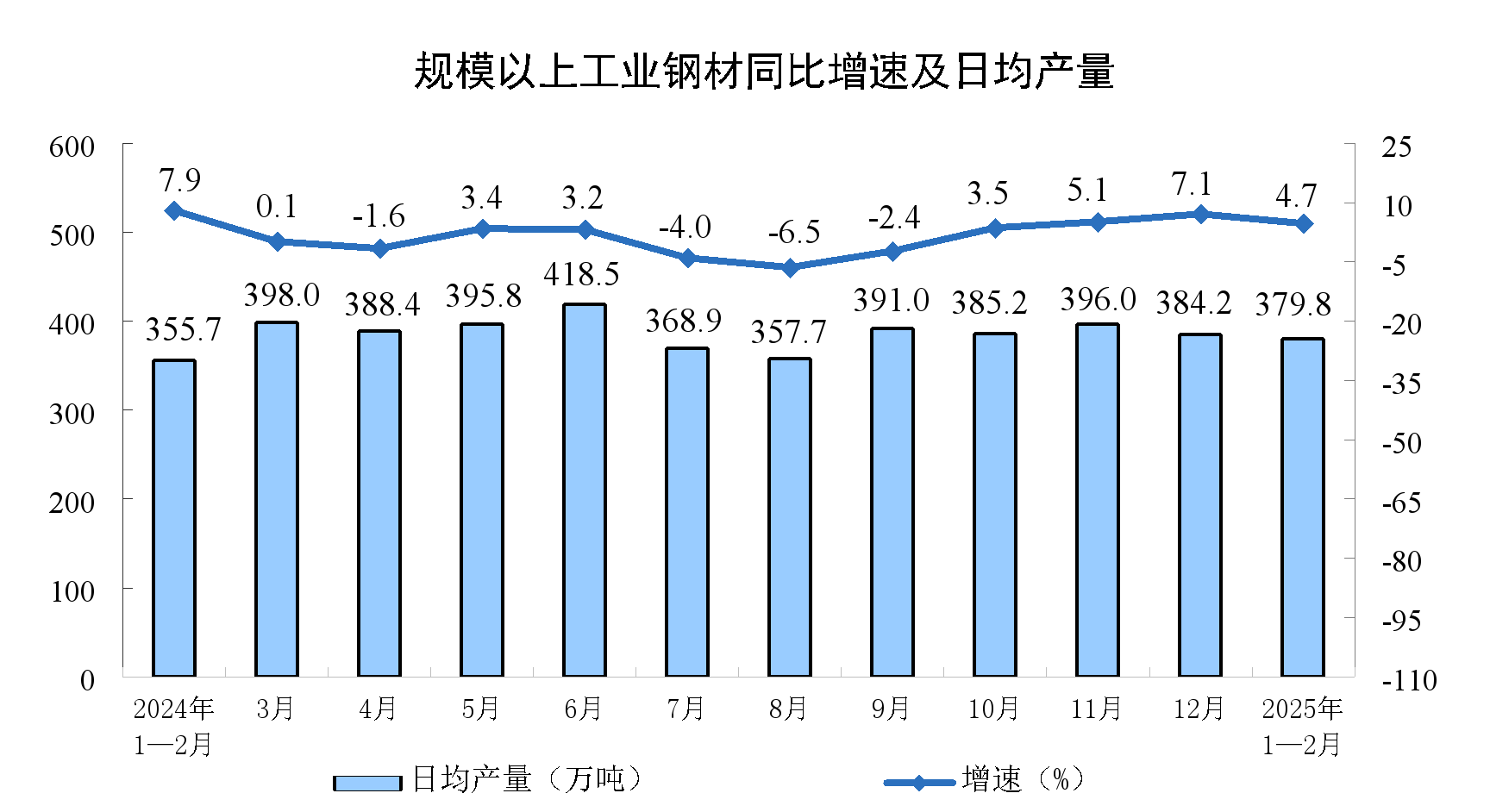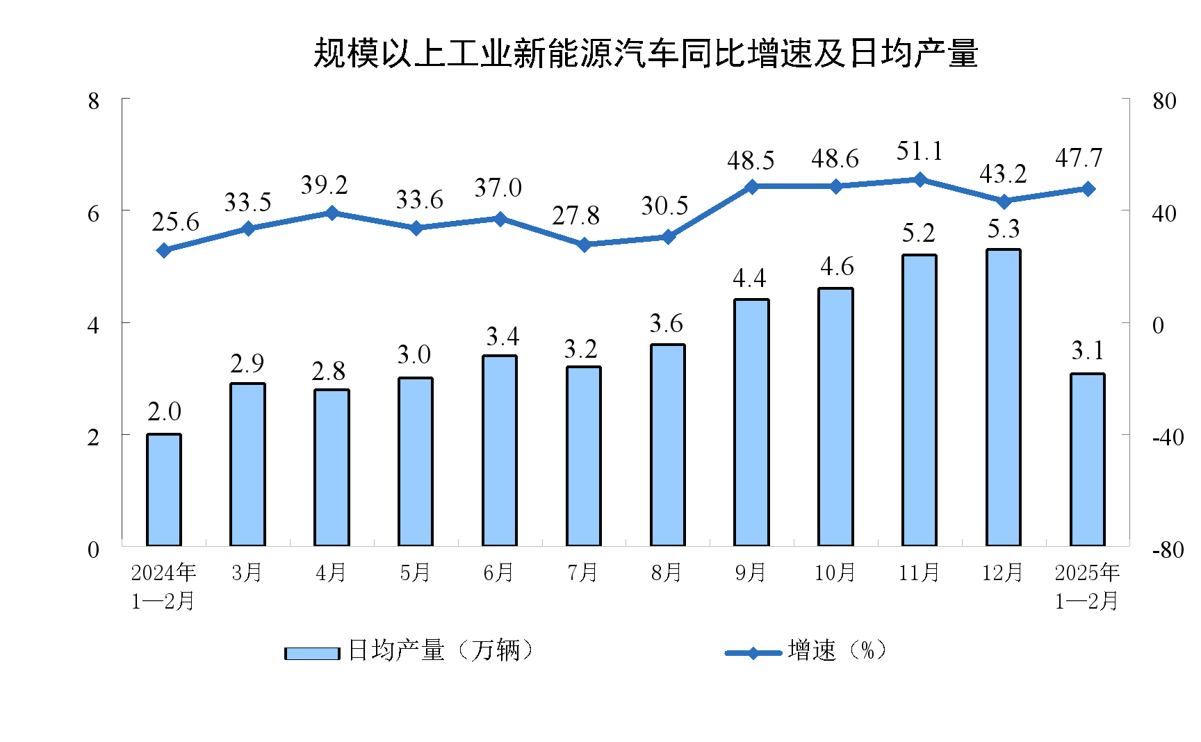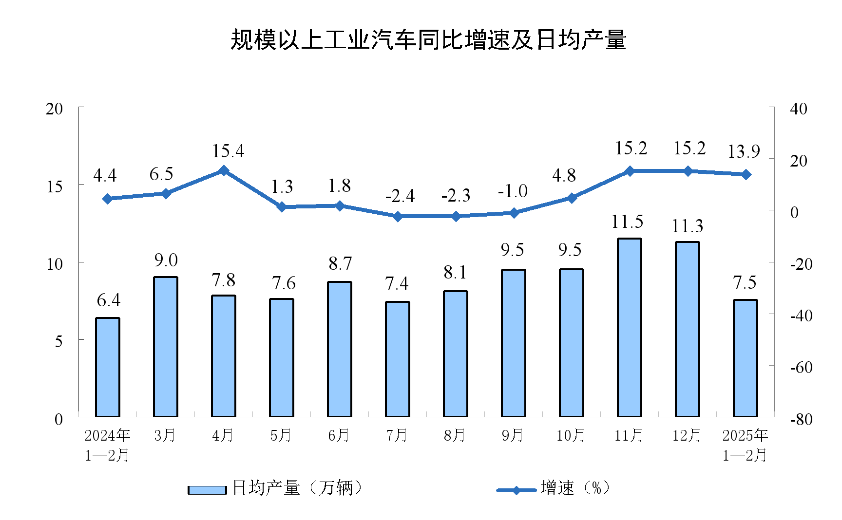 分产品看,1—2月份,规模以上工业623种产品中有378种产品产量同比增长。其中,钢材22409万吨,同比增长4.7%;水泥17099万吨,下降5.7%;十种有色金属1294万吨,增长1.4%;乙烯658万吨,增长17.6%;汽车445.4万辆,增长13.9%,其中新能源汽车181.7万辆,增长47.7%;发电量14921亿千瓦时,下降1.3%;原油加工量11917万吨,增长2.1%。