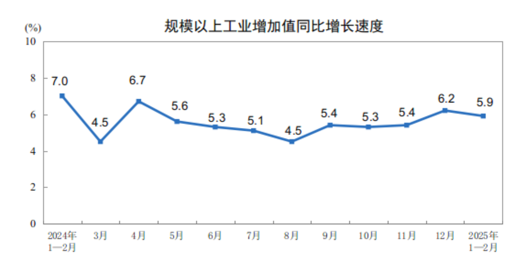 1—2月份,规模以上工业增加值同比实际增长5.9%(增加值增速均为扣除价格因素的实际增长率)。从环比看,2月份,规模以上工业增加值比上月增长0.51%。