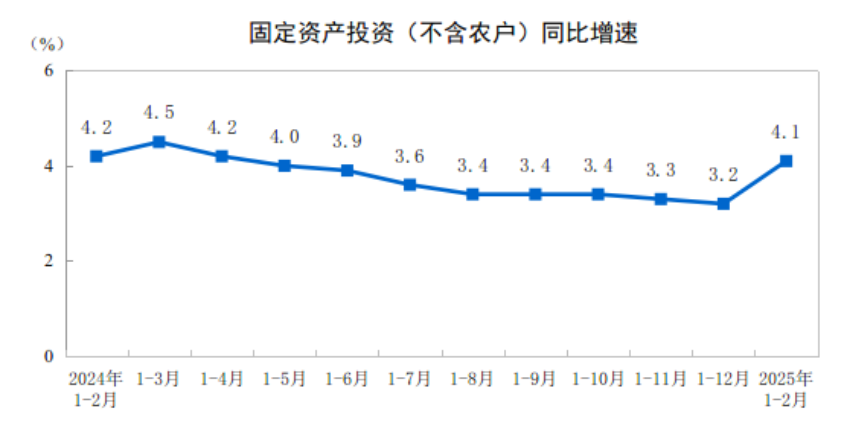 2025年1—2月份,全国固定资产投资(不含农户)52619亿元,同比增长4.1%(按可比口径计算,详见附注7),增速比2024年全年加快0.9个百分点。其中,民间固定资产投资26717亿元,总量与去年同期基本持平。从环比看,2月份固定资产投资(不含农户)增长0.49%。