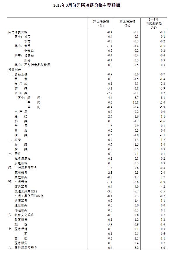2025年3月份,全国居民消费价格同比下降0.1%。其中,城市下降0.1%,农村下降0.3%;食品价格下降1.4%,非食品价格上涨0.2%;消费品价格下降0.4%,服务价格上涨0.3%。1—3月平均,全国居民消费价格比上年同期下降0.1%。 3月份,全国居民消费价格环比下降0.4%。其中,城市下降0.4%,农村下降0.3%;食品价格下降1.4%,非食品价格下降0.2%;消费品价格下降0.4%,服务价格下降0.4%。 一、各类商品及服务价格同比变动情况 3月份,食品烟酒类价格同比下降0.6%,影响CPI(居民消费价格指数)下降约0.17个百分点。食品中,鲜菜价格下降6.8%,影响CPI下降约0.15个百分点;蛋类价格下降1.6%,影响CPI下降约0.01个百分点;粮食价格下降1.5%,影响CPI下降约0.03个百分点;猪肉价格上涨6.7%,影响CPI上涨约0.08个百分点;鲜果价格上涨0.9%,影响CPI上涨约0.02个百分点。 其他七大类价格同比六涨一降。其中,其他用品及服务、衣着价格分别上涨6.2%和1.3%,教育文化娱乐、生活用品及服务价格分别上涨0.8%和0.6%,居住、医疗保健价格均上涨0.1%;交通通信价格下降2.6%。 二、各类商品及服务价格环比变动情况 3月份,食品烟酒类价格环比下降0.9%,影响CPI下降约0.24个百分点。食品中,鲜菜价格下降5.1%,影响CPI下降约0.11个百分点;蛋类价格下降2.7%,影响CPI下降约0.02个百分点;畜肉类价格下降2.2%,影响CPI下降约0.07个百分点,其中猪肉价格下降4.4%,影响CPI下降约0.06个百分点;鲜果价格下降1.6%,影响CPI下降约0.03个百分点。 其他七大类价格环比三涨两平两降。其中,生活用品及服务、衣着、其他用品及服务价格分别上涨1.3%、0.7%和0.4%;居住、医疗保健价格均持平;交通通信、教育文化娱乐价格分别下降1.4%和0.8%。 附注 1.指标解释 居民消费价格指数(Consumer Price Index,简称CPI)是度量居民生活消费品和服务价格水平随着时间变动的相对数,综合反映居民购买的生活消费品和服务价格水平的变动情况。 2.统计范围 居民消费价格统计调查涵盖全国城乡居民生活消费的食品烟酒、衣着、居住、生活用品及服务、交通通信、教育文化娱乐、医疗保健、其他用品及服务等8大类、268个基本分类的商品与服务价格。 3.调查方法 采用抽样调查方法抽选确定调查网点,按照“定人、定点、定时”的原则,直接派人到调查网点或从互联网采集原始价格。数据来源于全国31个省(区、市)约500个市县、近10万家价格调查点,包括商场(店)、超市、农贸市场、服务网点和互联网电商等。 4.数据说明 由于“四舍五入”原因,有时会出现合计数据与分类数据高值或低值相同的情况。