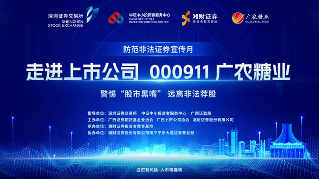 在深交所、中证投服中心和广西证监局指导下,湘财证券投教基地联合广农糖业(股票代码:000911)开展 “理性投资伴我行” 走进上市公司活动。本次直播将以中小投资者视角,全方位深入了解上市公司,通过高管面对面交流与行业专家解读,搭建投资者与上市公司的沟通桥梁,提升资本市场透明度。