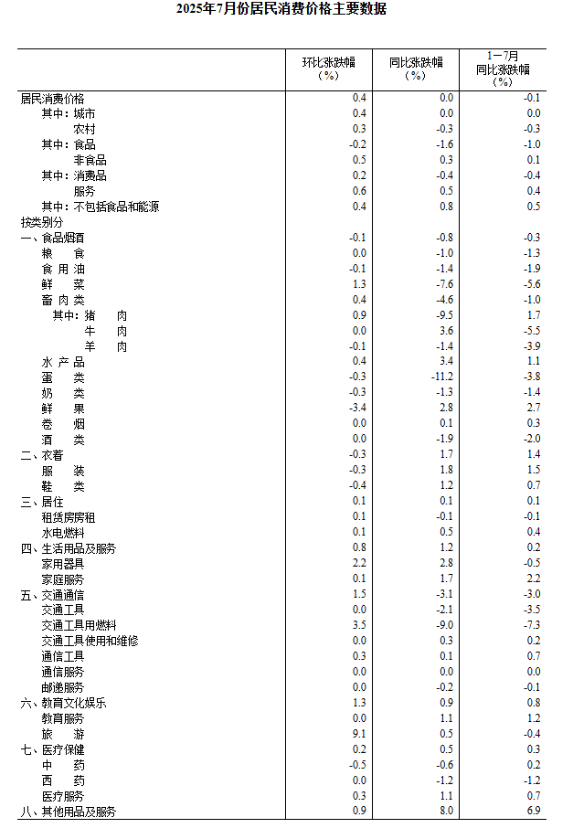 2025年7月份,全国居民消费价格同比持平。其中,城市持平,农村下降0.3%;食品价格下降1.6%,非食品价格上涨0.3%;消费品价格下降0.4%,服务价格上涨0.5%。1—7月平均,全国居民消费价格比上年同期下降0.1%。
