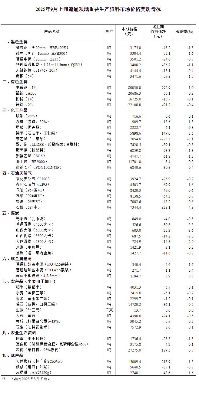 据国家统计局网站消息,国家统计局14日公布2025年9月上旬流通领域重要生产资料市场价格变动情况。