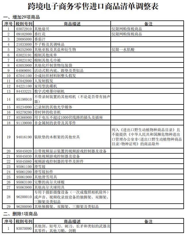 此次调整,在跨境电子商务零售进口商品清单(2019年版)基础上,增加了滑雪用具、家用洗碟机、番茄汁等29项近年来消费需求旺盛的商品。删除一项商品:其他剑、短弯刀、刺刀、长矛和类似的武器及其零件;其他刀鞘、剑鞘。同时,根据近年我国税则税目变化情况调整了部分商品的税则号列,根据监管要求调整优化了部分清单商品备注。