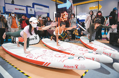 日前,2023亚洲运动用品与时尚展在国家会议中心举行。国内外220家展商、360余个品牌集体亮相,展览面积达3万平方米,涵盖滑雪、骑行等丰富的户外运动项目。图为参观者在展会上体验桨板瑜伽。新华社记者 张晨霖摄